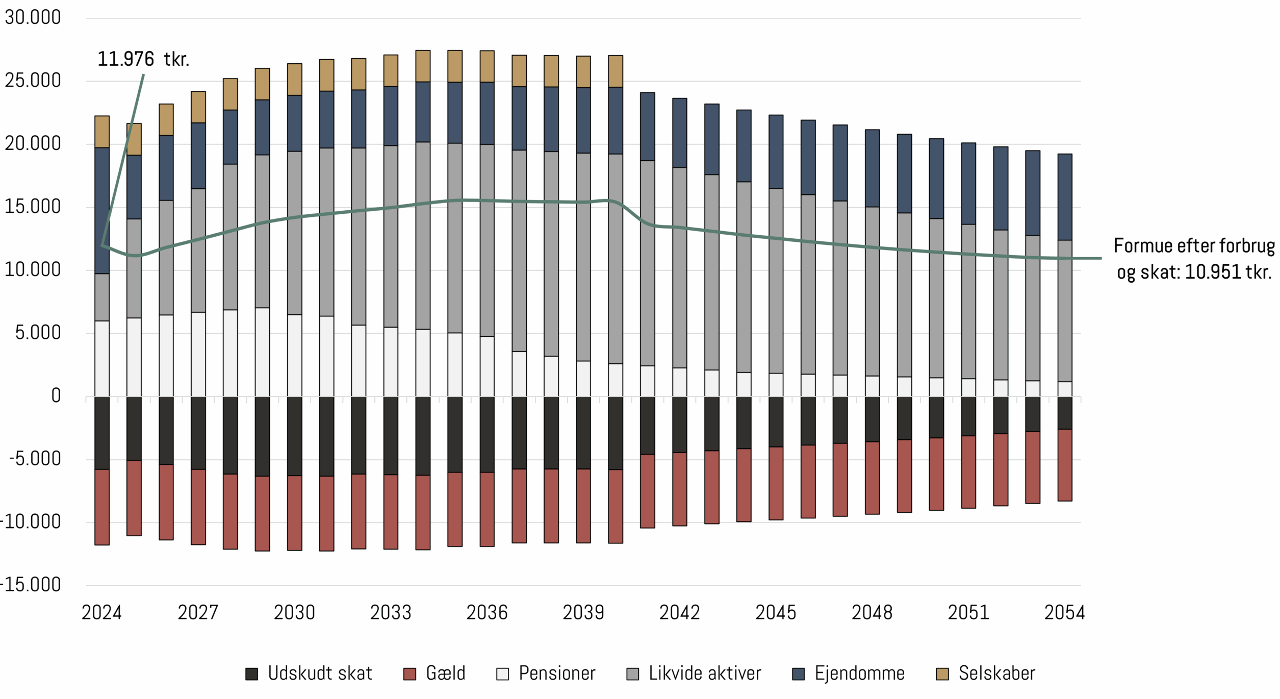 Formålet med prognosen er ikke at beregne en ”eksakt” formue om et givet antal år. Det er derimod at give et overblik over, hvordan formuen kan forventes at udvikle sig under forskellige forudsætninger. Det er et ”dialogværktøj”, som vi gennemgår sammen på et møde.